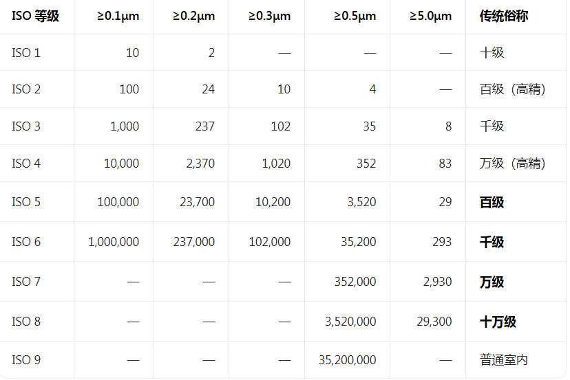 无尘车间(洁净室)等级核心按 ISO 14644-1(国际)、中国 GB/T 25915.1(等同 ISO)、医药 GMP(A/B/C/D) 三大体系划分,以单位体积空气内 **≥0.1μm、≥0.5μm、≥5μm* 粒子最大允许浓度判定,数字越小洁净度越高。